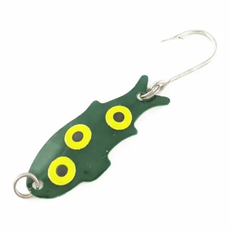 Sammakkoväritykset ovat jo pitkään olleet olennainen osa kevytkalastajan vieherasiaa, ja tämän Shoff's Big Triple Teazerin syvänvihreä pinta korostaa klassista amerikkalaista uistinsuunnittelua. Uistimen pituus on 3,5 cm (1 1/2") ja paino 2 g (1/16 oz). Tässä pienessä lusikassa on kolme selkeää keltaista iskupistettä mustalla keskustalla, jotka on sijoitettu kyljen suuntaisesti. Kalamaiseen sivuprofiiliin kuuluu sille tyypillinen pyrstölovi sekä tukevalla uistinrenkaalla kiinnitetty terävä yksittäiskoukku. Tämä Yhdysvalloissa valmistettu Shoff’sin yksilö (tuotekoodi 24022) on säilynyt erinomaisessa 5/5-kunnossa; alkuperäinen maalipinta on kirkas ja komponentit ovat täysin ehjiä. Tämän kevyen vieheen heittäminen kevyt- tai UL-välineillä mahdollistaa tarkan tarjoilun rakenteiden tai kasvuston reunaan.