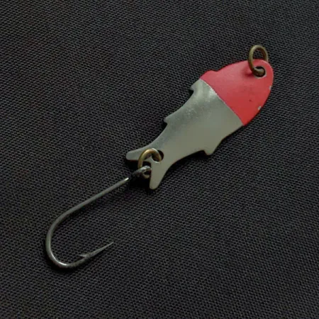 Nikkelin ja punaisen maalin yhdistelmä viimeistelee tämän 3 cm (1 1/4") vieheen klassisen ulkoasun, joka edustaa Shoff's Triple Teazerin hienostunutta muotoilua. Vain 1,1 grammaa (1/32 oz) painavassa stanssatussa metallirungossa on selkeä kalan profiili, mikä korostaa sen yhdysvaltalaista valmistusperintöä. Koveralla taustapuolella on selvästi näkyvä valmistajan leima, joka yksilöi vieheen tuotekoodilla 22327. Varustukseen kuuluu messinkisellä uistinrenkaalla kiinnitetty terävä yksitahokoukku, joka on tarkoitettu kevyeen kalastukseen taimenelle tai ahvenkaloille. Kunnoltaan tämä yksilö on luokiteltu 5/5, ja sen pinta on säilynyt erinomaisesti; kiillotettu nikkeli ja kirkkaanpunainen pääväritys ovat yhä loistavia ja ehjiä. Nokan toinen messinkinen uistinrengas toimii siiman pääasiallisena kiinnityspisteenä.