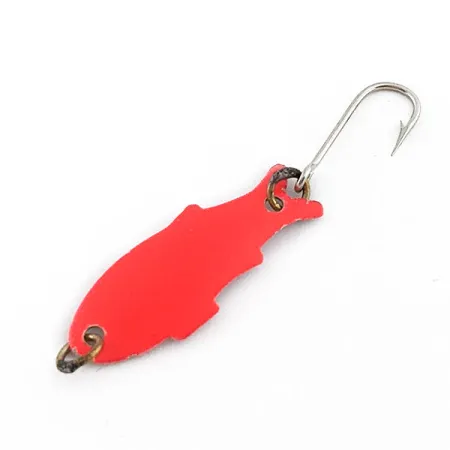 Tämän metallisen lusikkauistimen taakse on leimattu selkeästi nimi ”SHOFF’S TRIPLE TEAZER”, joka on Washingtonin osavaltiosta kotoisin olevan Shoff’s Tackle Companyn tunnusmerkki. Painoltaan 1,1 gramman (1/32 oz) ultrakevyt viehe on rakennettu kalamaiseen runkoon, jossa on kaksivärinen puna-valkoinen kuviointi. Etupuoli on maalattu tasaisella punaisella värillä, kun taas kääntöpuolelta paljastuu metallinen hopeanvalkoinen pohja stanssatulla nimellä. Tämän yksilön tuotekoodi on 22344, ja sen kuntoluokitus on 5/5, mikä näkyy erittäin hyvin säilyneenä maalipintana ja alkuperäisenä varustuksena. Viehe on varustettu kahdella messinkisellä uistinrenkaalla ja yhdellä hopeanvärisellä koukulla, joka on edelleen terävä ja käyttövalmis. Se on suunniteltu kevyeen heittokalastukseen tai uisteluun taimenelle ja ahvenkaloille, ja sen muotoilu jäljittelee pientä syöttikalaa.