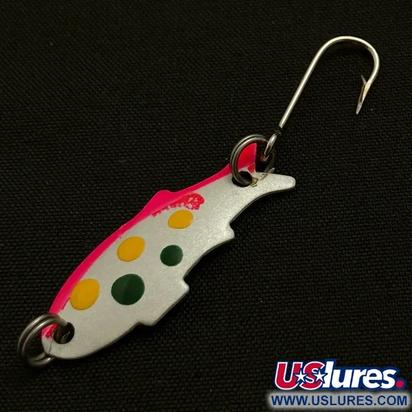 Vain 1,1 grammaa (1/32 oz) painava Shoff's Triple Teazer on pienikokoinen mutta erittäin yksityiskohtainen esimerkki amerikkalaisesta finesse-vieheestä. Tässä 3 cm (1 1/4") pituisessa vieheessä, tuotekoodiltaan 23537, on metallirunko hopeisella viimeistelyllä ja kirkkaalla vaaleanpunaisella selkäraidalla. Kylkiä koristavat kolme keltaista ja kaksi metsänvihreää täplää, jotka luovat voimakkaan kontrastin kiiltävää metallia vasten. Kunnoltaan viehe on 5/5; maalipinta on täysin ehjä ja metallipinnat ovat puhtaat. Varustukseen kuuluu kaksi uistinrengasta ja yksi peräkoukku, mikä on tyypillinen varustus tälle ultrakevyeseen heittokalastukseen suunnatulle mallille. Vaikka luettelo ilmoittaa pohjaväriksi kuparin, tässä yksilössä on näkyvissä heijastava hopeapinnoite. Porrastettu pyrstöprofiili ja kalanmuotoinen siluetti määrittelevät Triple Teazerin ominaispiirteet, tehden siitä erikoistyökalun taimenen ja muiden jalokalojen tai ahvenen kalastukseen.