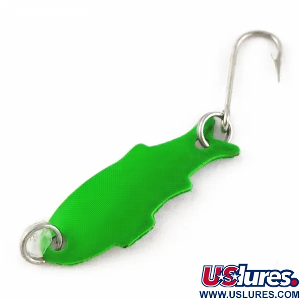 Kirkkaanvihreä väritys kiinnittää heti huomion tässä Yhdysvalloissa valmistetussa pienessä metallivieheessä. Vain 1/32 unssia (1 g) painava Shoff's Triple Teazer on luetteloitu tuotekoodilla 24070, ja se tarjoaa katsauksen vintage-ultralight-kalastusvälineiden historiaan. Meistetty metallirunko luo hoikan, kalamaisen profiilin, ja sen pituus on 1 1/4 tuumaa (3 cm). Varustukseen kuuluu hopeanvärinen pitkävartinen koukku takana sekä uistinrenkaat molemmissa päissä helppoa kiinnitystä varten. Yksilö on 5/5-kunnossa, ja siinä on puhdas ja tasainen pinta ilman käytön jälkiä. Shoff’sin uistimet suunniteltiin usein erottuviksi vaihtoehdoiksi kalastajille, jotka tavoittelevat pienempiä lajeja makeassa vedessä.