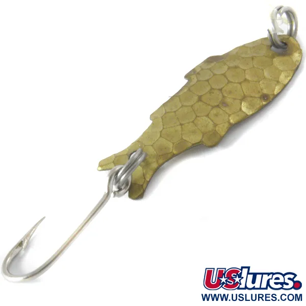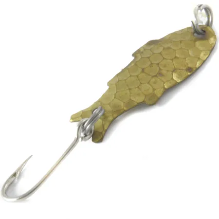 Pakotettu messinkipinta antaa tälle vintage-lusikalle erottuvan suomumaisen ulkonäön, joka auttaa sitä jäljittelemään pientä saaliskalaa kirkkaassa vedessä. Shoff's Triple Teazer on 3 cm (1 1/4") pitkä ja 1,1 g (1/32 oz) painava ultrakevyt klassikko USA:sta. Tämä yksilö, tuotekoodiltaan 4099, on kunnoltaan 4/5; sen pinnat ovat puhtaat ja kalamaista runkoa reunustavat evät ovat selvästi stanssatut. Uistimessa on hopeanväriset uistinrenkaat kärjessä ja perässä sekä yksi terävä koukku. Siluetti muistuttaa pientä kalaa, jossa on suippo pyrstö ja hieman leveämpi pää. Etupuolen pakotettu viimeistely luo monivivahteisia valonheijastuksia, kun taas kovera taustapuoli on tasainen, tuoden alkuperäisen messinkivärin selvästi esiin.