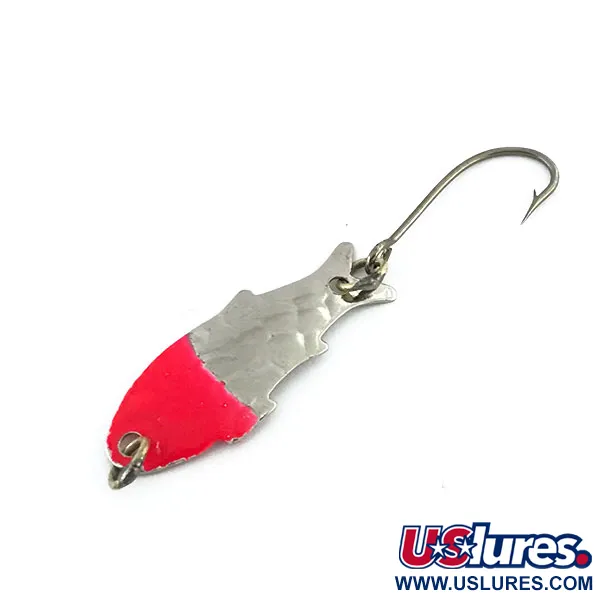 Tämä tasan 3 cm (1 1/4") pitkä Shoff's Triple Teazer on varustettu metallirungolla, jossa on selkeä vasaroitu nikkelipinta. Etuosan kirkkaan vaaleanpunainen maali luo voimakkaan visuaalisen kontrastin. Vain 1,1 g (1/32 oz) painava uistin on muotoiltu pienen syöttikalan tavoin, ja siinä on selkeä pyrstöevän siluetti. Metallirungon kääntöpuolella on selkeä 'SHOFF'S TRIPLE TEAZER' -leima, joka kertoo yhdysvaltalaisen valmistajan alkuperästä tuotekoodilla 8973. Tämä yksilö on käyttämätön (arvosana 5/5), ja siinä on kirkas, puhdas pinta sekä terävä yksihaarainen koukku, joka on kiinnitetty pienellä uistinrenkaalla. Yksihaarainen koukku osoittaa, että uistin on suunniteltu kevyeen heittokalastukseen tai uisteluun lajeille kuten taimen ja ahvenkalat.