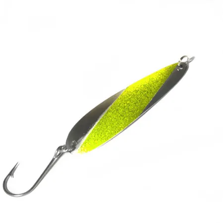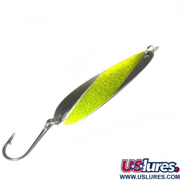 Tämä 11,5 g (2/5 oz) painava Slammer-lusikka on varustettu erottuvalla diagonaalisella kultaisella kimallevirralla kiillotetun nikkelirungon päällä. Tämä USA:ssa valmistettu 9,5 cm (3 3/4") uisteluspesialisti kantaa valmistajan nimeä meistettynä puhtaaseen nikkelitaustaan. Malli 0480 on varustettu raskaaseen käyttöön yhdellä vankalla koukulla, joka on kiinnitetty kestävän uistinrenkaan kautta – kokoonpano, jota Suurten järvien ja rannikkoalueiden kalastajat suosivat vahvalukuisia lajeja pyydettäessä. Viimeistely tarjoaa voimakkaan kontrastin ja yhdistää nikkelin heijastavuuden kulta-chartreuse-aksentin teksturoituun hohdeeseen. Kuntoarvion ollessa 4/5, metallipinnat säilyttävät alkuperäisen loistonsa ja varusteet pysyvät tiukkoina ja toimivina. Erityisesti tasaiseen uisteluvauhtiin suunniteltu Slammer 0480:n pitkä ja kapea profiili on muotoiltu uimaan vakaasti eri nopeuksilla.