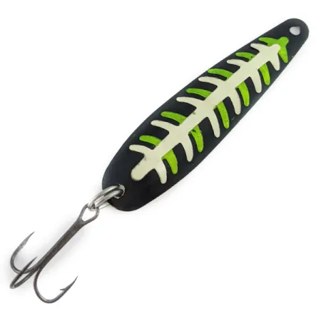 Mattamusta viimeistely toimii pohjana hohtavalle luurankokuviolle tässä 1/3 unssin (8,5 g) lusikkauistimessa. USA:ssa valmistettu Slammer Glow -malli (tuotekoodi 22551) hyödyntää voimakaskontrastista vihreää ja valkoista itsevalaisevaa väritystä. 3 1/4 tuuman (8,5 cm) metallirunko on 5/5-kunnossa, ja maalatut yksityiskohdat ovat säilyneet terävinä ja ehjinä. Kääntöpuolella uistimessa on yhtenäinen luonnonvalkoinen hohtopinnoite näkyvyyden parantamiseksi syvässä tai sameassa vedessä. Yksi uistinrengas yhdistää tummapintaisen kolmihaarakoukun perään, ja kavennettu kärki on valmiiksi porattu viehelukkoa tai peruketta varten. Maalauksen rajaus neonvihreiden tehosteiden ja valkoisen luurankorakenteen välillä on säilynyt selkeänä koko vieheessä.