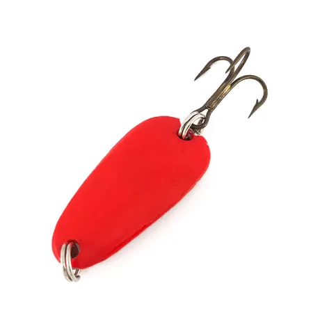 Sølvkroken Special Classic UV -sarjan lusikkauistin on kooltaan kompakti 1 1/4" (3 cm), ja siinä on silmiinpistävä fluoresoiva viimeistely, joka erottuu jopa hämärässä. Tuotekoodilla 7825 tunnistettu 7 gramman painoinen malli on suunniteltu heittotarkkuutta ja syvän veden näkyvyyttä varten. Mattapunainen ulkopinta muuttuu UV-valossa, kuten toisesta kuvasta näkyy, tarjoten selkeän hehkun, joka on tarkoitettu käytettäväksi pimeissä ympäristöissä tai syvyyksissä. Tukevien uistinrenkaiden avulla kiinnitetty pronssattu kolmihaarakoukku on säilynyt hyvin ja heijastaa merkille tyypillisiä korkeita valmistusstandardeja. Vieheen pinta on erinomaisessa 5/5-kunnossa, ja siinä on sileä ja kirkas pinnoite koko rungossa.