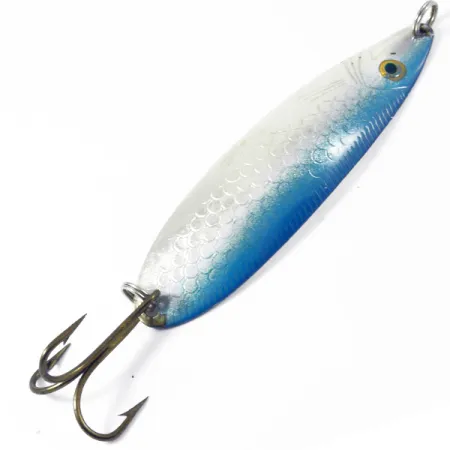 Hopeinen suomukuvio ja reunan eloisa sininen välähdys määrittelevät tämän klassisen norjalaisen lusikkauistimen viimeistelyn. 1/2 oz (15 g) painava Storlaksen on lohen ja suuren taimenen kalastajien vakiovaruste, jota käytetään pääasiassa heittokalastukseen tai uisteluun virtaavassa vedessä. Pituudeltaan 3 1/2" (9 cm) olevan uistimen kiillotetussa hopeisessa taustapuolessa on syvälle meistetty aito „Sølvkroken Storlaksen“ -leima. Tässä nimenomaisessa yksilössä on tuotekoodi 3354, ja se edustaa korkealaatuista metallityötä, jota Norjan johtavalta kalastusvälinevalmistajalta odotetaan. Varustukseen kuuluu tukeva, pronssiviimeistelty kolmihaarakoukku, joka on kiinnitetty vahvalla uistinrenkaalla varmistaen kestävyyden raskaassa käytössä. Kunto on erinomainen 5/5, ja kuvioidulla etupuolella on erittäin puhtaat pinnat ja tarkat yksityiskohdat. Nokassa oleva ylimääräinen uistinrengas tarjoaa turvallisen kiinnityspisteen suoralle siimalle tai leikarille.