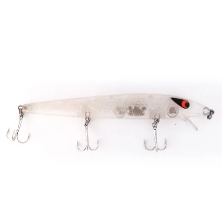 Läpinäkyvät valkoiset suomut peittävät tämän 13 cm rungon omaavan jerkbaitin, tarjoten hienovaraisen esityksen kirkkaissa vesissä. Painoltaan 13 g oleva Smithwick Suspending Rattlin’ Rogue on suunniteltu pysymään tietyssä syvyydessä kelauksen pysähtyessä. Tämä yksilö, tuotekoodiltaan 10481, edustaa Smithwick-merkille ominaista perinteistä amerikkalaista käsityötaitoa. Heitossa uistin saavuttaa 0,3–2 metrin syvyyden, ja vetouistelussa se voi sukeltaa 3–4 metriin. Kolme kolmihaarakoukkua ja rakenneosat ovat 5/5-kunnossa, eikä viimeistelyssä tai silmiinpistävissä puna-mustissa silmissä ole kulumisen merkkejä. Sisäinen helistinkammio ja tasapainotuspainot näkyvät läpikuultavan muovirungon läpi.