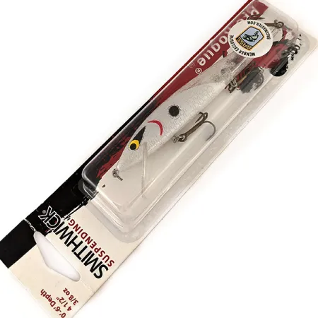 Puhdas White-viimeistely määrittää tämän 11 cm (4 1/4") jerkbaitin rungon, joka on klassinen profiili välivedessä oleskelevien petokalojen pyyntiin. Tämä 11 g (2/5 oz) painava viehe on suunniteltu pysymään neutraalina vesipatsaassa – tekniikka, jota suositaan, kun tarvitaan pysäytys laukaisemaan isku. Tämä Smithwick Suspending Rattlin’ Rogue, tuotekoodiltaan 11154, on käyttämätön ja alkuperäisessä USA:ssa valmistetussa pakkauksessaan. Varustukseen kuuluu kolme terävää kolmihaarakoukkua ja kirkas uintilevy, joka on kalibroitu 0–1,8 metrin (0–6') syvyyteen heitossa ja jopa 3,1–4,2 metrin (10–14') syvyyteen uistelussa. Pakkauksessa on Bassmaster Member Exclusive -tarra, joka tekee tästä keräilykohteen. Rungon sisällä olevat räminäkuulat lisäävät ääntä vedenalaiseen esiintymiseen.