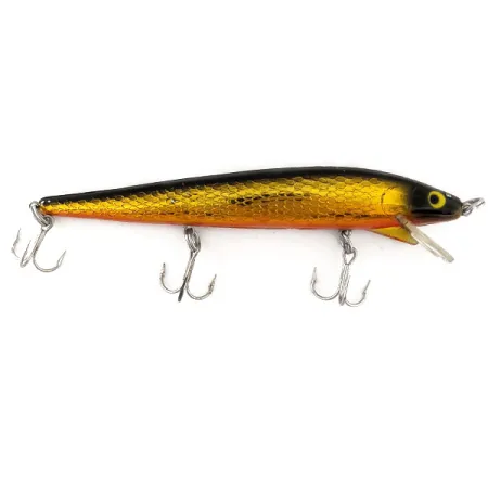 Tasan 12 g (2/5 oz) painava kultasuomuinen jerkbait on viimeistelty erittäin tarkasti koko 12 cm (4 3/4") pituudeltaan. Smithwick Suspending Rattlin’ Rogue 12 (tuotekoodi 11379) on näyttävä vaappu, jossa on musta selkä, kultaiset suomukyljet ja kirkkaan oranssi vatsa. Valmistettu Yhdysvalloissa, ja se on varustettu kolmella terävällä hopeanvärisellä kolmihaarakoukulla sekä sisäisellä räminäkammiolla. Suspending-mallina se on suunniteltu pysymään paikallaan välivedessä; se saavuttaa 0,3–2 metrin syvyyden heitossa ja sukeltaa 3–4 metriin uistelussa. Tämän yksilön kunto on 5/5, sillä se on käyttämätön: kirkasuintilevy ja keltaiset silmät mustilla pupilleilla ovat virheettömiä. Pieni hopeinen logo pään päällä viimeistelee tämän klassisen amerikkalaisvieheen autenttisen ulkoasun.