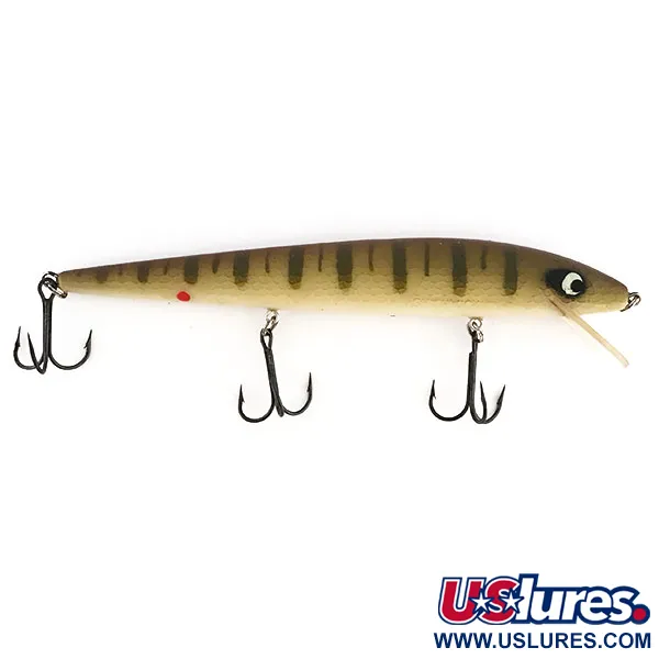 Klassinen haukiväritys tummilla pystyraidoilla ruskealla pohjalla koristaa tämän 14 cm (5 1/2") vintagewaapun runkoa. Tuotekoodilla 8906 tunnettu Smithwick Suspending Rattlin’ Rogue on suunniteltu neutraalisti kelluvaksi (suspending), jolloin se jää paikalleen väliveteen 0,3–2 metrin syvyydessä heitettäessä. Vetouistelussa kirkas uintilevy vie vieheen 3–4 metrin syvyyteen. Tämä yksilö on 5/5-kunnossa, ja siinä on tallella upea viimeistely, tunnusomaiset valko-mustat silmät sekä punainen iskupiste pyrstökoukun lähellä. Kolme kolmihaarakoukkua ovat tukevasti kiinni 14 g (1/2 oz) rungossa, jonka sisällä on Smithwickin vintage-tuotannolle tyypillinen räminäkoneisto.