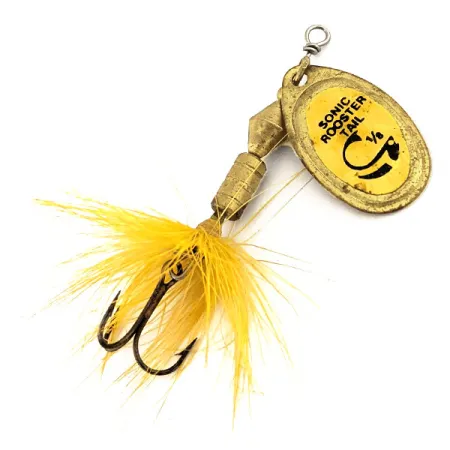 Kirkkaankeltainen höyhenpyrstö erottaa tämän Yakima Bait -klassikon, jonka muotoiluperintö juontaa juurensa Howard Wordenin innovaatioihin 1950-luvulla. Painoltaan 3/16 unssia (5 g) ja pituudeltaan 2 1/4 tuumaa (5,5 cm) olevassa vieheessä on willow-mallinen lippa, johon on meistetty teksti "SONIC ROOSTER TAIL". Segmentoidussa metallirungossa on lämmin messinginvärinen viimeistely, ja se päättyy terävään kolmihaarakoukkuun, jota tiheät keltaiset kuidut suojaavat. Tämä nimenomainen yksilö, tuotekoodiltaan 12614, on 5/5-kunnossa ja kaikin puolin kirkas ja puhdas. Se on suunniteltu kelaustyyliin, joka perustuu lipan laajaan pyörimiseen värinän aikaansaamiseksi vesipatsaassa. Höyhenpyrstön pehmeä veteen laskeutuminen on tehnyt siitä historiallisen suositun valinnan kalastajille, jotka kalastavat pienillä, kovan kalastuspaineen taimenpuroilla, joissa hiipiminen on välttämätöntä.