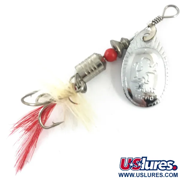 Tämä 4g (1/8oz) painoinen South Bend -lippa edustaa huolellista valmistusjälkeä, joka on tyypillistä klassisille yhdysvaltalaisille kalastusvälineille. Hopeoidussa ovaalissa lipassa on selkeä meistetty leijona-logo sekä valmistajan nimi, jotka tunnistavat sen klassiseksi 4668-malliksi. Kirkkaanpunainen helmi toimii iskupisteenä uritetun metallirungon ja höyhenperän välillä, jonka kokonaispituus on 5,5cm (2 1/4"). Kolmihaarakoukku on sidottu taitavasti valkoisilla ja punaisilla höyhenillä, jotka ovat säilyneet tuuheina ja värikkäinä. Kuntoluokitukseltaan 5/5 olevan vieheen hopeapinnat ja lankasidokset ovat säilyneet poikkeuksellisen hyvin. Lipan meistetyt yksityiskohdat ovat helposti luettavissa ja erottuvat selvästi rungon heijastavasta pinnasta.