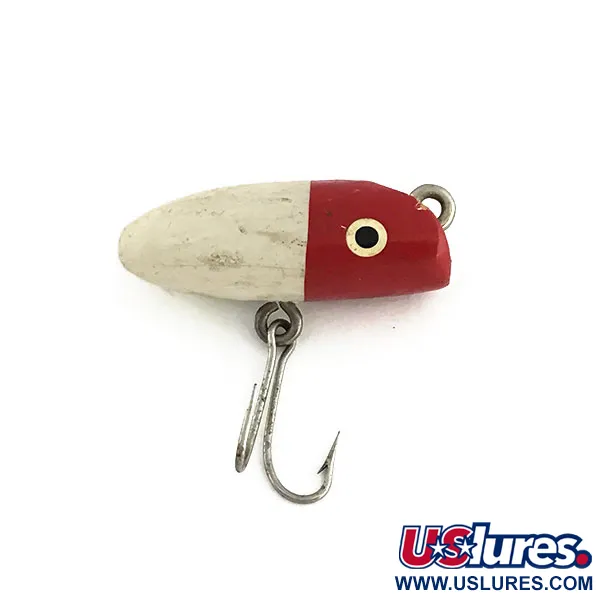 Vain 3 cm (1 1/4") pituinen klassinen punapää ja valkoinen runko tässä vintage-yksilössä kiinnittävät välittömästi jokaisen perhokalastajan huomion. Tämä South Bend Fly-Oreno, tuotekoodilla 9227, on pienoisversio tunnetusta Oreno-mallista, painoltaan 1,6 g (1/16 oz) hienovaraista esittämistä varten. Puurakenteessa on syvä kovera naama, joka on suunniteltu rikkomaan pintakalvoa perhosiimalla uitettaessa. Varustukseen kuuluu tukeva kaksoiskoukku, joka on kiinnitetty vatsapuolen silmukkaruuvilla tasapainon varmistamiseksi. Huomioi maalattu silmäyksityiskohta, jossa on selkeä musta pupilli kultaisen renkaan päällä, mikä on tyypillistä South Bendin tuotantokauden käsityölle. Ikäänsä nähden viimeistely on pysynyt huomattavan eloisana, ja se ansaitsee kuntoarvosanan 5/5 hyvin säilyneen kiiltonsa ja puhtaiden pintojensa ansiosta. Siiman kiinnityspiste sijaitsee pään päällä, mikä on ominaista Oreno-sarjan pintavieheille.
