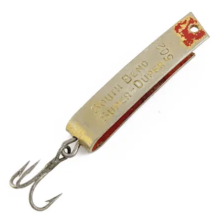 Nikkeli-pintaan selkeästi meistetty 'SOUTH BEND SUPER-DUPER 502' -merkintä osoittaa tämän yksilön olevan klassinen osa amerikkalaista kalastushistoriaa. Pituudeltaan 3 cm (1 1/4") oleva taitettu metallirunko noudattaa tunnusomaista U-muotoilua, joka on suunniteltu kevyeen heittokalastukseen ja uisteluun. Tämä 2,5 g (3/32 oz) painoinen uistin on säilyttänyt suuren osan alkuperäisestä kiillostaan, vaikka siimalenkin lähellä olevissa punaisissa maalitehosteissa onkin hieman kulumaa. Rungon kääntöpuolelle alaosaan on meistetty 'PAT. PEND'G' -merkintä, mikä on tyypillistä tuotekoodin 16953 varhaisille valmistuserille. Kuntoluokitukseltaan uistin on 4/5, ja metallipinnassa on joitakin merkkejä säilytyksestä vieherasiassa. Yksi kolmihaarakoukku on kiinnitetty takapäähän uistinrenkaalla, mikä täydentää alkuperäisen varustuksen.
