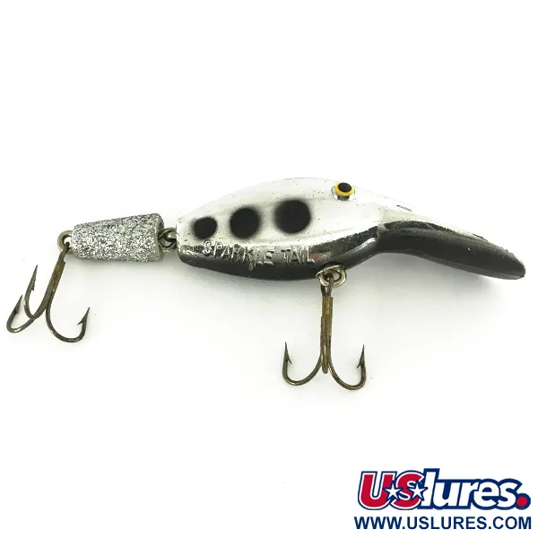 Hopeointi antaa tälle 8 cm pitkälle nivelvaapulle klassisen heijastavuuden, joka vangitsee valon mistä tahansa kulmasta. Tuotekoodilla 7223 merkitty Eppinger Sparkle Tail sisältää erottuvan hilepinnoitetun takaosan, joka erottaa sen aikakautensa tavallisista koviin vieheistä. Runkoa korostavat kolme selvää mustaa täplää kyljessä, jotka sijaitsevat aivan stanssatun "SPARKLE TAIL" -mallinimen yläpuolella. Painoltaan 10-grammainen viehe koostuu kahdesta segmentistä, jotka on yhdistetty tukevalla metallisaranalla. Uintilevy on suunniteltu kelluvasta sukeltavaan uintiin. Hopeaviimeistely on säilynyt erinomaisesti (kuntoarvio 5/5), vaikka alkuperäiset vatsa- ja pyrstökolmihaarakoukut osoittavat vintage-teräkselle tyypillistä tummumista. Keltaiset silmät pienillä mustilla pupilleilla sijaitsevat näkyvästi edessä, tarjoten selkeän iskupisteen metallisessa profiilissa. Tämä amerikkalaisvalmisteinen viehe hyödyntää kelluvuuteen perustuvaa muotoilua, joka on tarkoitettu heitto- tai uistelutekniikoihin.