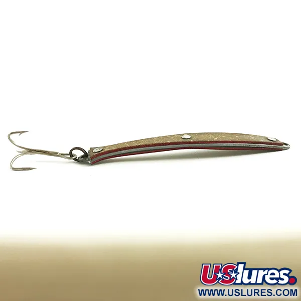 Tasan 1/2 unssia (14g) painavan vintage-lusikkauistimen profiilia leimaavat kerroksellinen muotoilu ja kimaltava kultahileviimeistely. Sparky Jr. Spoon Sparkling Minnow (tuotekoodi 5751) edustaa amerikkalaista muotoilua vuodelta 1951. Reunoilla syvänpunainen sävy luo kaksivärisen efektin teksturoitua kultarunkoa vasten, joka on kiinnitetty kolmella näkyvällä hopeanvärisellä niitillä. Aito "SPARKY JR" -leima on puristettu materiaaliin ja se on selvästi luettavissa viimeistelyn läpi. Pituudeltaan 3 1/2 tuumaa (9cm) oleva yksilö on 5/5-kunnossa, ja siinä on erinomaisesti säilynyt pinta ja kirkkaat metalliosat. Peräpäähän on kiinnitetty perinteinen kolmihaarakoukku, joka soveltuu heittokalastukseen tai vetouisteluun.