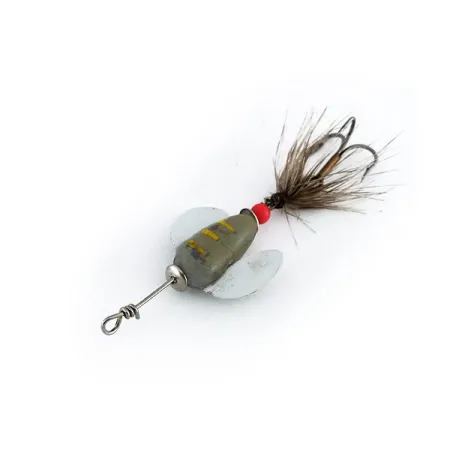 Tämä höyhenillä koristeltu Spin-n-Glo on pituudeltaan 5 cm lenkistä koukun mutkaan, ja siinä on selkeä Yakima Bait -siluetti. Harmaata runkoa korostavat kolme keltaista raitaa ja valkoiset siivet, mikä on suunniteltu näkyvyyttä varten erilaisissa jokiolosuhteissa. Painoltaan 0,6 g (1/64 oz) oleva, Yhdysvalloissa valmistettu viehe sisältää kirkkaanpunaisen helmen, joka toimii välikkeenä ja kiintopisteenä höyhenperää vasten. Rungossa on lieviä käytön jälkiä ja viimeistely on hieman pehmentynyt, mikä antaa sille autenttisen, testatun luonteen (3,5/5). Höyhenkolmikoukku on säilynyt hyvin, tuoden luonnollista tekstuuria kokonaisuuteen. Tuotekoodilla 9946 luetteloitu muotoilu perustuu rungon kelluvuuteen ja siipien pyörimiseen virtauksessa.