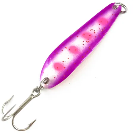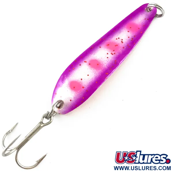 Tämä Advance Tacklen 5g (3/16oz) vetolusikka on varustettu klassisella vasaroidulla kupariviimeistelyllä kääntöpuolella. Etupinta vaihtuu eloisista purppuranvärisistä reunoista kirkkaan valkoiseen keskustaan, jota korostavat neljä erottuvaa vaaleanpunaista pistettä ja hienon hieno punainen kimalle. Tämä 5,5 cm (2 1/4") pitkä, Yhdysvalloissa valmistettu Stinger Scorpio (tuotekoodi 4282) on varustettu nimeen ja Michigan-alkuperään liittyvällä leimalla suoraan hunajakennokuvioiseen kuparipinnoitteeseen. Tämä yksilö on 5/5-kunnossa, säilyttäen täyden kiiltonsa metallisella puolella ja terävän viimeistelyn maalatulla puolella. Varustukseen kuuluu terävä kolmihaarakoukku ja kaksi uistinrengasta, jotka on optimoitu vetouisteluun, jossa kontrastia erottuvan maalin ja lämpimän kuparin välillä hyödynnetään tehokkaimmin. Kapea ja pitkänomainen profiili on tyypillinen 1900-luvun lopun Suurten järvien uisteluvieheille, joilla tavoitellaan lohta ja taimenta.
