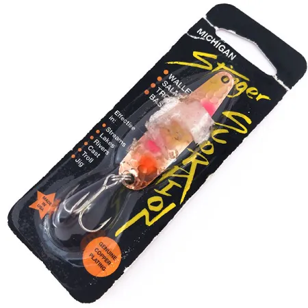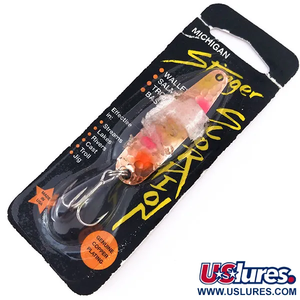 Aito kuparipinnoite erottuvalla vasaroidulla viimeistelyllä on tämän 5,5 cm (2 1/4") Stinger Scorpion -lusikkauistimen perusta. Advance Tacklen Yhdysvalloissa valmistama uistin kantaa tuotekoodia 10058, ja siinä on «Confusion»-värikuvio, joka on tunnistettavissa kirkkaan vaaleanpunaisista ja oransseista yksityiskohdista kuvioitua kuparia vasten. Painoltaan 5 g (3/16 oz) oleva viehe on suunniteltu useille eri lajeille, ja alkuperäisessä pakkauksessa mainitaan sen tehokkuus kuhalle, lohelle, taimenelle ja ahvenelle. Michigan Stinger -brändillä on pitkäaikainen maine Suurten järvien alueella, erityisesti uistelu- ja heittokalastuksessa. Viehe on alkuperäisessä läpipainopakkauksessaan ja on käyttämätön, vastaten kuntoluokitusta 6. Varustukseen kuuluu vankka uistinrengas ja terävä kolmihaarakoukku, jotka on suunniteltu kestämään jigaamisen tai uistelun vaatimukset.