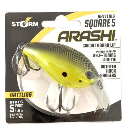 Ohuella ja kestävällä piirilevystä valmistetulla uintilevyllä varustettu Storm Arashi Rattling Square 5 on suunniteltu saavuttamaan 1,5 metrin (5 ft) uintisyvyytensä nopeasti myös hitaassa vauhdissa. Tämä 18 g (2/3 oz) painava ja 6 cm (2 1/4") pitkä viehe on väritykseltään Black Chartreuse Shad, joka tunnetaan tummasta suomukuvioidusta selästään ja kontrastisesta kylkitäplästään. Tämän käyttämättömän vieheen varustukseen kuuluu korkealaatuiset VMC-koukut, jotka on kiinnitetty käännettyihin koukkupidikkeisiin. Tämä rakenne pitää koukut lähempänä runkoa ja vähentää tarttumista esteisiin. Tasaisen suorituskyvyn varmistamiseksi heitossa ja uistelussa siinä on patentoitu itse säätyvä siiman kiinnityspiste, joka sallii vapaan liikkeen. Tuotekoodilla 11335 tunnistettava viehe on alkuperäisessä pakkauksessaan, jossa kerrotaan sen sisäisestä räminäkoneistosta ja kelluvista ominaisuuksista. Tämä yksilö on koottu Indonesiassa.
