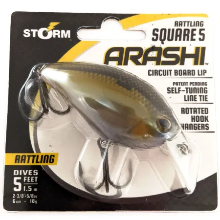 Tämä 18 g (2/3 oz) painava ja 6 cm (2 1/4") pitkä vaappu hyödyntää ohutta piirilevymateriaalista valmistettua uintilevyä saavuttaakseen 1,5 metrin (5 ft) uintisyvyyden herkästi reagoiden. Storm Arashi Rattling Square 5, tuotekoodiltaan 11953, on viimeistelty läpikuultavalla Ghost-värityksellä, joka on ihanteellinen luonnollista profiilia vaativiin olosuhteisiin. Tämä yksilö on käyttämätön ja uudenveroisessa kunnossa. Teknisiin kohokohtiin kuuluu itse säätyvä siiman kiinnityspiste (self-tuning line tie), joka pitää vieheen uinnin suorana kelauksen aikana ilman manuaalista säätöä. Koukkurenkaiden rakenne on ainutlaatuinen: käännetyt koukkulenkit vetävät kolmihaarakoukut lähemmäs runkoa vähentäen tarttumista esteisiin, mutta mahdollistaen silti suurempien koukkujen käytön. Sisäiset räminäkuulat takaavat jatkuvan akustisen ärsykkeen vieheen kulkiessa vesipatsaan läpi.