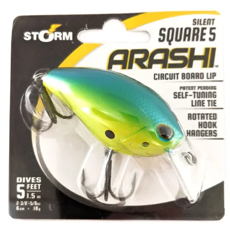 Kirkkaat "Parrot"-sävyt vaihtuvat eloisasta limenvihreästä syvään sinivihreään tämän Storm Arashi Silent Square 5 -vaapun (tuotekoodi 11706) selässä. Tarkkaan kosketukseen esteiden kanssa suunniteltu viehe sisältää ohuen piirilevynokan, joka on suunniteltu saavuttamaan 1,5 metrin uintisyvyys. Paino on 18 g ja rungon pituus 6 cm. Rakenteeseen kuuluu itsekeskittyvä siimalenkki, joka on tarkoitettu pitämään uinti suorana upoksissa olevien rakenteiden läpi. Varustukseen kuuluu käännettyihin lenkkeihin kiinnitetyt VMC-koukut, mikä pitää koukut lähempänä runkoa vähentäen pohjatärppejä. Tämä yksilö toimitetaan alkuperäisessä pakkauksessaan Indonesiasta ja on käyttämätön. Kyseessä on Arashi-sarjan hiljainen versio, joka luottaa fyysiseen profiiliinsa ja veden syrjäyttämiseen sisäisten rämistimien sijaan.