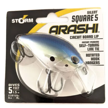 Ohut lasikuituinen (circuit board) uintilevy erottaa tämän Storm Arashi Silent Square 5 -vaapun muista. Se on suunniteltu saavuttamaan 1,5 metrin (5ft) uintisyvyytensä nopeasti myös hitaassa vauhdissa. Painoltaan 18 g (2/3oz) oleva viehe on varustettu patentoidulla "Self-Tuning Line Tie" -kiinnityksellä, jonka vapaasti liikkuva rakenne pitää uintiliikkeen suorana ilman manuaalista säätöä. Värikuviona on puhdas särki-imitaatio: metallinsininen selkä vaihtuu hopeisiin suomuihin ja vaaleaan vatsaan, jota korostaa selkeä musta kylkitäplä. Pituudeltaan 6 cm (2 1/4") runko sisältää käännetyt koukkulenkit, jotka pitävät VMC-koukut lähempänä runkoa vähentäen tarttumista esteisiin. Tämän yksilön tuotekoodi on 11707, se on käyttämätön ja alkuperäisessä vuoden 2013 pakkauksessaan. Rapala VMC Corpille Indonesiassa valmistettu tekninen muotoilu keskittyy hiljaiseen esitystapaan; sisäiset räminäkuulat on jätetty pois hienovaraisempaa lähestymistapaa varten kirkkaissa tai kalastuspaineen alla olevissa vesissä.