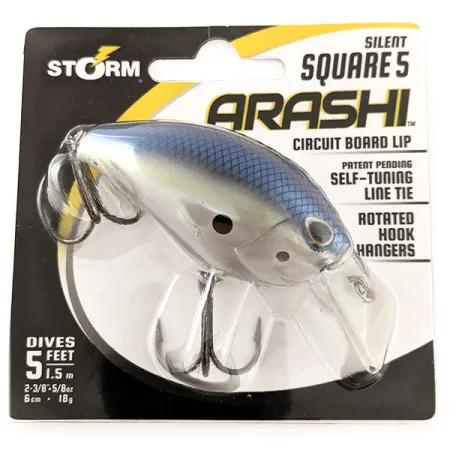 Painoltaan 18 g (5/8 oz), vieheen rungossa on sinisuomuinen selkä, joka vaihtuu hopeanvalkoisiin kylkiin, joissa on selkeä tumma täplä. Storm Arashi Silent Square 5, tuotekoodi 11951, on 6 cm (2-3/8") pitkä ja varustettu ohuella piirilevylipalla 1,5 metrin (5 ft) uintisyvyyden saavuttamiseksi. Tässä hiljaisessa vaapussa käytetään itsekeskittyvää uintilenkkiä, joka on vapaasti liikkuva rakenne suoran uinnin ylläpitämiseksi kelauksen aikana. Paremman suorituskyvyn varmistamiseksi esteiden joukossa, käännetyt koukkupidikkeet pitävät VMC-koukut lähellä vieheen runkoa, mikä vähentää tarttumisriskiä. Indonesiassa valmistettu viehe tarjoaa rullaavan uinnin voimakkaalla potkulla. Tämä yksilö on käyttämätön ja sen kuntoluokitus on 6.