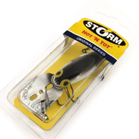 Metallinhopeat suomut kontrastina mustalle selälle tässä 5 cm (2") Storm Original Hot'N Tot -vaapussa. Osana "Original Series" -sarjaa tässä mallissa on perinteinen metallinen uintilevy, jonka avulla se saavuttaa 1,5–4,0 metrin (5–13 jalan) syvyyden. Tämä kyseinen uistin, tuotekoodiltaan H103 (sisäinen tietokanta 12897), on 6,5 gramman (1/4 oz) malli, jota käytetään usein uistelussa, heittokalastuksessa tai ajelehtimisessa. Indonesiassa valmistettu rakenne sisältää laadukkaat VMC-koukut ja tunnusomaiset ylisuuret keltaiset silmät mustilla pupilleilla. Pakkaus on vuoden 2012 tekijänoikeudella ja väriksi on ilmoitettu "MET SLV/BLK BACK". Uistin on käyttämätön ja alkuperäisessä läpinäkyvässä blisterpakkauksessa, jossa on keltainen "Think Like A Fish" -taustakortti. Meistattu metallilevy on tukevasti kiinni, mikä korostaa tältä erikoistuneelta syvännemallilta odotettua kestävyyttä.