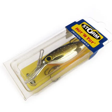 Hehkuvat kultaiset suomut ja voimakaskontrastinen musta selkä määrittelevät tämän 6,5 g (1/4 oz) vaapun ulkonäön. Tuotekoodilla 9876 tunnettu Storm Original Hot 'N Tot on edelleen vakiovaruste uistelua ja harhailukalastusta harrastaville. Tässä 5 cm (2") mallissa on tunnusomainen metallinen uintilevy, joka pitää vieheen uinnin vakaana jopa turbulentissa vedessä. Keräilijät arvostavat, että viehe on käyttämätön ja alkuperäispakkauksessa, jolloin tehtaan viimeistely ja koukut ovat säilyneet uudenveroisina. Sini-keltaisen taustapahvin Original Series -merkintä vahvistaa sen olevan peräisin USA:n tuotantokaudelta. Kirkkaankeltainen silmä toimii selkeänä iskupisteenä metallista kultakylkeä vasten.