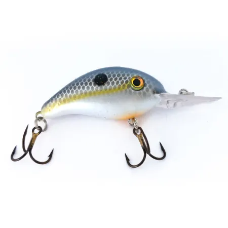 Suomukuvioitu siniharmaa selkä vaihtuu selkeään keltaiseen kylkiviivaan tässä 10 gramman (1/3oz) Strike King 4XD -vaapussa. Tuotekoodilla 10398 tunnistettavassa Sexy Shad -värityksessä on helmiäisvalkoinen vatsa ja hienovarainen oranssi vivahde uintilevyn alla. Tämä kelluva crankbait on suunniteltu saavuttamaan 2,4–3,6 metrin (8–12 ft) syvyys heitettäessä tai vedettäessä haukea ja kuhaa. Sisäiset räminäkuulat luovat teknisen ääniprofiilin, ja 5 cm (2") runko säilyttää kompaktin muodon. Molemmat pronssatut kolmihaarakoukut ovat erinomaisessa kunnossa, vastaten yksilön 5/5-kokonaiskuntoa. Yläkyljessä on yksittäinen musta täplä, joka on tämän värityksen tunnusmerkki. Suuri, kirkas uintilevy on tiukasti kiinni, valmiina syvän veden kalastukseen.