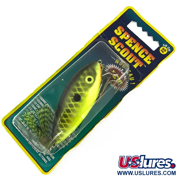 Tämä 10,5 g (3/8 oz) painoinen viehe, jossa on erottuva chartreuse-musta suomukuviointi ja selkeä kylkipiste (väri 245 535), on alkuperäisessä pakkauksessaan. Pituudeltaan 6,5 cm (2 1/2") oleva Strike King Spence Scout (tuotekoodi 7403) on kelluva ja äänekäs viehe, joka on suunniteltu pinta- ja pintakalvokalastukseen. Tämä erityinen "New Scout" -versio on tunnettu kahdesta siiman kiinnityspisteestään, jotka mahdollistavat eri uintisyvyydet 0,3–0,9 metrin (1-3 ft) välillä riippuen siitä, kumpaa rengasta käytetään. Meksikossa valmistettu yksilö on käyttämätön ja alkuperäisessä kunnossa (luokitus 6). Hyvin näkyvä keltainen silmä ja kylkien ristikkomainen suomukuvio antavat voimakkaan kontrastin ahvenkalojen pyyntiin sameassa vedessä.