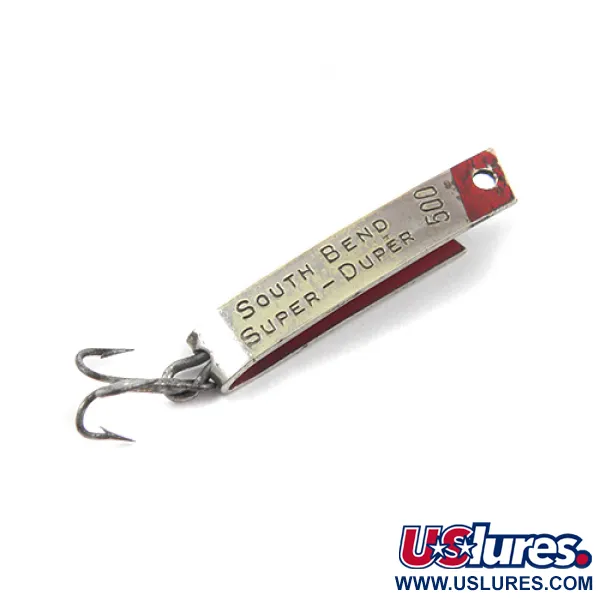 Heijastavaan nikkelirunkoon on selkeästi meistetty "SOUTH BEND SUPER-DUPER 500" -tunniste, joka on tämän ikonisen amerikkalaisvalmisteisen uistimen tunnusmerkki. Pituudeltaan 2,5 cm (1") olevassa ainutlaatuisessa U-muotoisessa metallirungossa on kirkkaanpunainen väritehoste kärjessä, mikä luo terävän visuaalisen kontrastin hopeiseen viimeistelyyn. Vain 1,4 g (3/64 oz) painava kevyt malli on suunniteltu ultrakevyeen heittokalastukseen tai hitaaseen uisteluun. Rakenteessa on pieni kolmihaarakoukku, joka on kiinnitetty suoraan metallin taitteessa olevan reiän läpi. Tuotekoodilla 2634 varustettu USA:ssa valmistettu viehe on säilynyt hyvin 4/5-kunnossa, säilyttäen ne puhtaat linjat ja selkeät meistokset, joista South Bend tunnettiin.