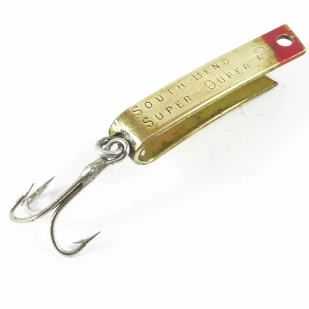 Kullattuun metallirunkoon selkeästi stanssattu tuotemerkki ja mallinumero tunnistavat tämän South Bend Super Duper 500 -vieheen todelliseksi amerikkalaiseksi klassikoksi. Vain 2,5 cm (1") pitkä ja kevyt 1,4 g (3/64 oz) painava yksilö edustaa merkin puolivälin tuotannolle ominaista ikonista U-muotoilua. Metallipinnat ovat säilyttäneet kirkkaan kullanhohtonsa, jota korostaa erottuva punainen kärki siimasilmukan lähellä. Kääntöpuolelle on stanssattu terävästi patenttinumero 2 719 378, mikä vahvistaa sen historiallisen taustan tuotekoodilla 3486. Kuntoluokitus 4/5 osoittaa, että lusikkauistimesta on pidetty hyvää huolta, ja alkuperäinen kolmihaarakoukku sekä uistinrengas ovat tallessa. Tämä malli on suunniteltu finesse-kalastukseen tai kevyeen uisteluun. Merkinnät ovat edelleen erittäin luvunmukaisia, mikä kertoo alkuperäisen yhdysvaltalaisen valmistusprosessin laadusta.