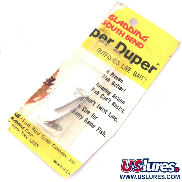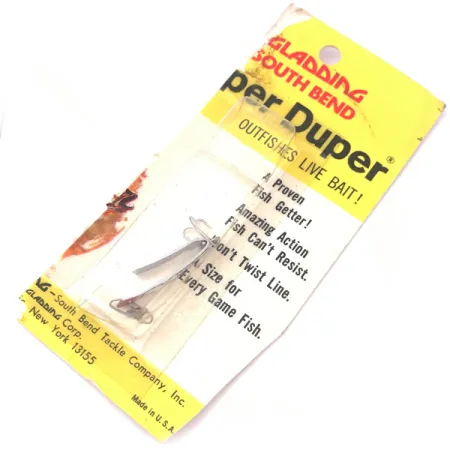 Kiillotetut nikkelipinnat ja kirkkaanpunainen kärki määrittelevät tämän 2,5 cm (1") South Bend Super-Duper 500 -vieheen, joka on pienikokoinen U-muotoinen metalliuistin. Vain 1,4 g (3/64 oz) painava yksilö on säilynyt käyttämättömänä alkuperäisessä Gladding-South Bend Tackle Companyn pakkauksessa tuotekoodilla 3930. Rakenne koostuu yhdestä taivutetusta metallipalasta, joka yhdistää lusikan ja lipan ominaisuudet. Valmistettu Yhdysvalloissa, ja keltaisessa vintage-pahvissa on aikakauden grafiikkaa sekä väite, että se päihittää elävän syötin. Varustukseen kuuluu pieni kolmihaarakoukku kaarevan rungon takaosassa, suojattuna alkuperäiseen kirkkaaseen muovikuoreen.