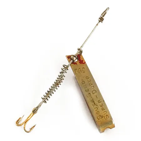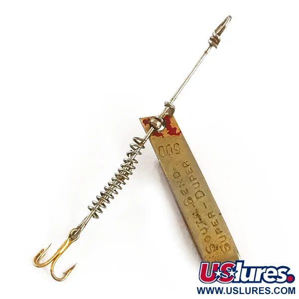 Tämä vain 1,4 g (3/64 oz) painava ultrakevyt uistin on varustettu minimalistisella U-muotoisella rungolla, josta tuli perusvaruste yhdysvaltalaisille kalastajille. Messinkirungossa on selkeä punainen korostus siimalenkin lähellä, mikä antaa kontrastia metallipinnalle, jossa on South Bend -nimi ja Super Duper 500 -mallimerkintä. Vain 2,5 cm (1") pitkän uistimen varustukseen kuuluu yksi kolmihaarakoukku, joka on kiinnitetty läpivientilangalla ja suojaavalla jännitysjousella. Kuntoarvion 4/5 perusteella uistin on hyvin säilynyt, ja siinä on vain vähäisiä ikääntymisen merkkejä pienenä maalipinnan kulumisena taitoskohdassa. Sisäinen lankarakenne sisältää pienen metallihelmen ja kierrejousen, joka pitää koukun oikeassa asennossa heitossa tai uistelussa. Tämä tuotekoodilla 4684 tunnistettu yksilö hyödyntää metallilevyn yksinkertaista mutta tehokasta taitosta tavoitellun uintiprofiilin saavuttamiseksi.