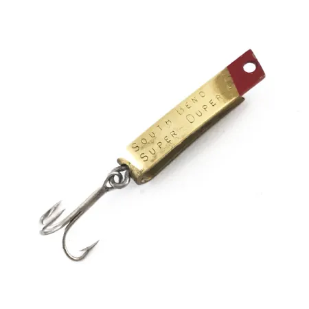 Tämä vain 3/64 oz (1,4 g) painava pieni lusikkauistin on klassinen ultra-light-valinta taimenelle ja ahvenkaloille. Tämän Super-Duper 500 -uistimen kullatussa messinkirungossa on selvästi metalliin meistetty ikoninen "SOUTH BEND SUPER-DUPER" -nimi. Siiman kiinnityskohdassa erottuva punainen kärki luo jyrkän kontrastin kultaista pintaa vasten. Kun 1 tuuman (2,5 cm) vieheen kääntää ympäri, paljastuu historiallinen patenttinumero 2719378, mikä vahvistaa sen alkuperän vuosisadan puolivälin amerikkalaiseen uistinmuotoiluun. Tässä tuotekoodilla 5257 yksilöidyssä kappaleessa on alkuperäistyylinen kolmihaarakoukku, joka on kiinnitetty uistinrenkaalla U-muotoiseen mutkaan. Viehe on hyväkuntoinen (arvosana 4/5), ja sen metallipinnoilla on vain lieviä ikääntymisen merkkejä.