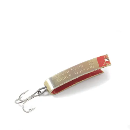 Kullanväriseen ulkopintaan on meistetty mallinimi ja "SOUTH BEND", mikä tekee tästä U-muotoisesta vieheestä tunnistettavan klassikon kenelle tahansa keräilijälle. Viehe on 3 cm (1 1/4") pitkä ja painaa vain 2,5 g (3/32 oz), joten se on suunniteltu kevyeen kalastukseen. Sisäpuoli ja kärki on viimeistelty kontrastivärisellä punaisella maalilla, joka erottuu metallisesta kultarungosta. Tuotekoodilla 2667 tunnistetun uistimen alapuolelle on meistetty patenttinumero 2 719 378, mikä vahvistaa sen olevan yhdysvaltalaista valmistetta. Yleiskunto on kunnioitettava 4/5, ja siinä on havaittavissa kevyitä käytön jälkiä, jotka korostavat sen vintage-charmiä. Takaosaan on kiinnitetty tavallinen kolmihaarakoukku yksinkertaisella uistinrenkaalla.