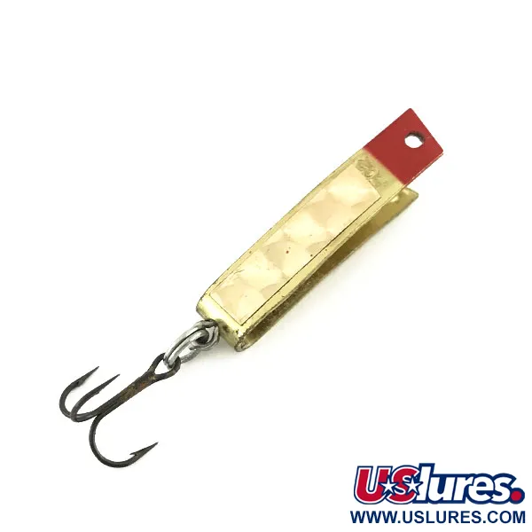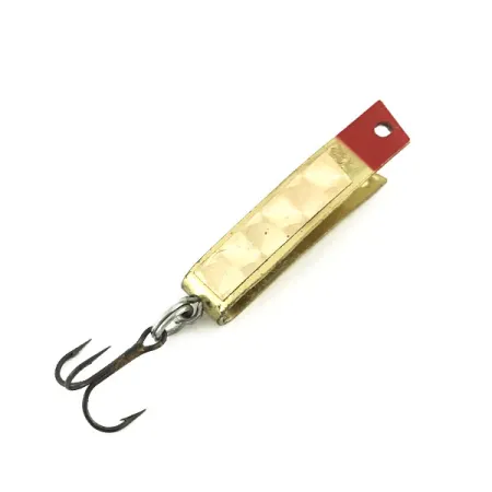 Tämä South Bend -yksilö on 1 1/4" (3 cm) pitkä, ja siinä on Super Duper 502 -mallille ominainen taitettu metallinen U-muoto. Kullatussa ulkopinnassa on kuvioitu, timanttimainen fasettikuvio, jota täydentää kiinteä punainen maalattu koroste siiman kiinnityskohdassa. Tuotekoodilla 8616 tunnistettava 3/32 oz (2,5 g) viehe yhdistää lusikan ja lipan ominaisuudet yhdeksi kompaktiksi profiiliksi. Messinkirungon takapuolelle on selvästi leimattu "PAT NO 2,710,478", mikä heijastaa sen historiallista valmistusta USA:ssa. Alkuperäisen loistonsa säilyttänyt viehe on 5/5-kunnossa, ja siinä on puhtaat metalliosat sekä terävä kolmihaarakoukku, joka on kiinnitetty uistinrenkaalla.
