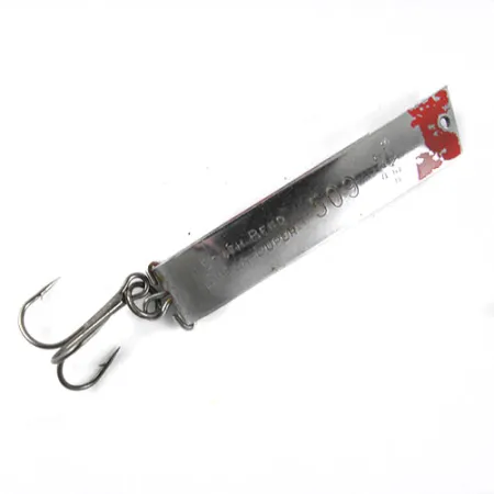 Kiillotettuun metallipintaan meistetty merkintä 509 tunnistaa tämän South Bend Super-Duper -uistimen klassiseksi esimerkiksi vuosisadan puolivälin kalastusvälinesuunnittelusta. Pituudeltaan 5,5 cm (2 1/4") ja painoltaan 11 g (2/5 oz) oleva yksilö (tuotekoodi 0819) sisältää tunnusomaisen U-muotoon taivutetun metallirungon. Nikkeliviimeistely tarjoaa kirkkaan heijastavan pinnan, jota korostaa punainen maalattu kärki siimalenkin lähellä. Tässä nimenomaisessa vieheessä on nähtävissä historiallisia jälkiä pienten kolhujen muodossa punaisessa maalissa, mikä antaa sille kuntoluokituksen 4/5. Se on varustettu yhdellä kolmihaarakoukulla, joka on kiinnitetty vahvalla uistinrenkaalla, ja se on tarkoitettu heittokalastukseen tai uisteluun makeassa vedessä. Valmistajan nimi, South Bend, on selvästi luettavissa kyljessä, mikä osoittaa sen olevan valmistettu Yhdysvalloissa.