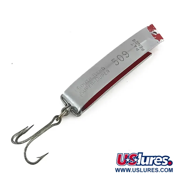 Kiillotettuun nikkelipintaan selkeästi stanssattu 'South Bend SUPER-DUPER 509' -merkintä tunnistaa tämän 5,5 cm (2 1/4") metallisen klassikon. Tämä Luhr Jensenin tuotanto, joka on luetteloitu tuotekoodilla 8413, sisältää ikonisen taitetun U-muotoisen muotoilun, joka tarjoaa erottuvan siluetin heittoon tai uisteluun. Ulkopinnassa on heijastava nikkelipinta, kun taas sisäpuoli on viimeistelty rohkealla punaisella, mikä luo voimakkaan visuaalisen kontrastin. Painoltaan 11 g (2/5 oz) uistin on varustettu terävällä kolmihaaralla, joka on kiinnitetty mutkan juureen. Pyrstöosasta löytyy 'PAT. PEND.' -kaiverrus sekä tehtaan reikä siiman kiinnitystä varten. Tämä yksilö saa 5/5 kuntoarvion, ja siinä on hyvin säilyneet metallipinnat ja vähäistä, aitoa maalin kulumista punaisessa sisäpinnoitteessa, mikä korostaa sen vintage-historiaa.