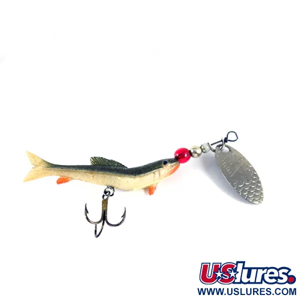 Leimattu nikkelilippa tekstillä 'SWISS SWING 1' koristaa tätä Renosky Luresin valmistamaa viehettä, tuotekoodi 1545. Painoltaan 3/32 unssia (2,5 g) oleva viehe yhdistää perinteisen lippauistimen rakenteen yksityiskohtaiseen pehmomuovirunkoon, jonka kokonaispituus on 2 1/4" (6 cm). Nickel-väritys tarjoaa luonnollisen saaliskalajäljitelmän tummalla selällä ja vaalealla vatsalla. Helmisarja — yksi kirkkaanpunainen ja kaksi metallista — erottaa lipan sangan kalankaltaisesta rungosta. Kevyillä välineillä kalastavalle vieheessä on yksi kolmihaarakoukku kiinnitettynä suoraan vatsan alle. Tämä yksilö on 5/5-kunnossa, säilyttäen erittäin puhtaan viimeistelyn niin metalliosissa kuin rungon joustavassa rakenteessa.