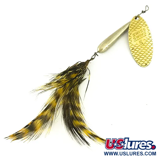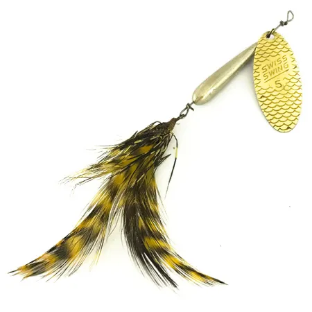 Messinkilehteen meistetty 'SWISS SWING 5' -teksti merkitsee tämän ranskalaisvalmisteisen lipan välittömästi eurooppalaisen muotoilun klassikoksi. Viehe painaa 9 g ja on pituudeltaan 8 cm. Sen lipassa on erottuva suomukuviointi, joka luo visuaalista syvyyttä. Torpedon muotoinen nikkelirunko toimii keskuspainona, ja perässä on kolmihaarakoukku, joka on koristeltu luonnollisen sävyisillä kelta-mustaraitaisilla höyhenillä. Tuotekoodilla 7055 tunnistettava Renosky Lures -yksilö osoittaa korkealaatuista kokoonpanoa lankapunotuissa osissaan ja siistissä viimeistelyssään. Tämän aikakauden ranskalainen valmistus tunnettiin erityisesti lipan tasapainon tarkkuudesta, mikä näkyy tässä höyhenmallissa symmetrisyytenä. Kunnossa 5/5 metalliosat ovat kirkkaat ja sidos on täysin ehjä.
