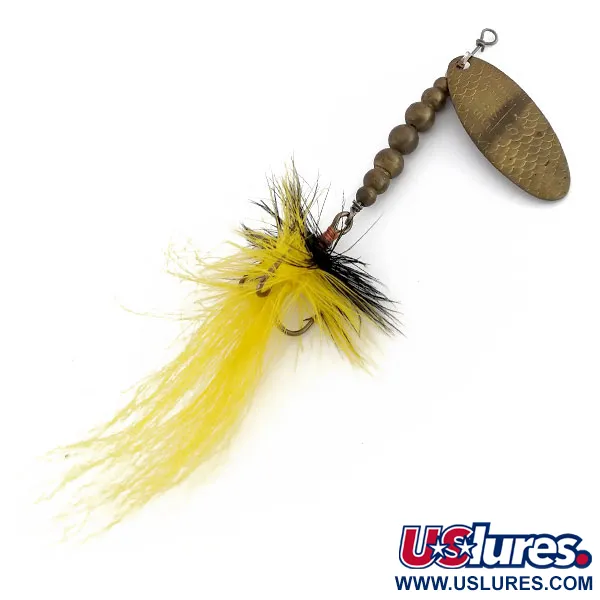 Eri kokoiset messinkihelmet muodostavat Renosky Lures Swiss Swing 5 -lipan painotetun rungon, jonka kokonaispaino on 1/4 unssia (7 g). Vasaroituun messinkilippaan on leimattu sen ranskalainen alkuperä, mikä on tyypillistä tämän aikakauden korkealaatuisille vintage-lipoille ja niiden tarkasti stanssatuille osille. Tuotekoodilla 9893 tunnistettu uistin on pituudeltaan 7 cm (2 3/4") ja kunnoltaan 5/5. Kolmihaarakoukkuun on sidottu kirkkaankeltaisia ja mustia höyheniä, jotka luovat voimakkaan kontrastin metallipintaan. Rakenteessa on messinkinen sanka ja lankavarmistettu silmukka turvallista kiinnitystä varten, säilyttäen ranskalaista tekoa olevan inline-lipan klassisen ilmeen.