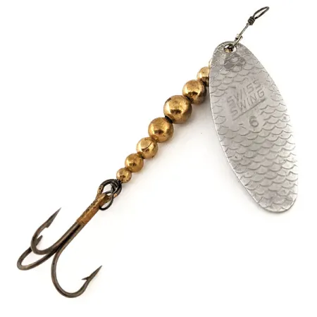 Kuusi erikokoista messinkihelmeä muodostavat tämän ranskalaista alkuperää olevan lipan painotetun rungon, jonka kokonaispaino on 5 g. Nikkelipintaiseen lippaan on selkeästi stanssattu nimi 'SWISS SWING 6', ja siinä on hienovarainen suomukuvio. Tämä Renosky Lures -malli, tuotekoodi 12635, on erinomaisessa 5/5-kunnossa säilynyt pala kalastushistoriaa. Pituudeltaan 8 cm uistin on rakennettu kestävän lankavarren ympärille. Alaosassa on vankka kolmihaarakoukku, ja yläosassa on leikarisilmukka, joka on suunniteltu vähentämään siiman kiertymistä käytön aikana.