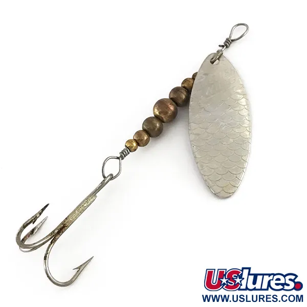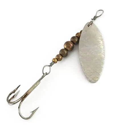 Tämän 4 g (1/8 oz) painoisen Renosky Lures Swiss Swing -lipan hopeaviimeisteltyyn lehteen on pakotettu selkeä suomukuvio. Tämän tuotekoodilla 9171 yksilöidyn vieheen kokonaispituus on 7 cm (2 3/4"). Runko koostuu kuudesta eri kokoisesta messinkihelmestä, jotka tuovat tarvittavaa painoa heittämiseen ja uintisyvyyden hallintaan. Kolmihaarakoukku on kiinnitetty tukevasti rungon takaosan lankasilmukkaan, mikä osoittaa Renoskyn tunnettua vankkaa laatua. Lippalehden kääntöpuoli on sileä ja kiillotettu voimakkaan välkkeen luomiseksi. Viehe on 5/5-kunnossa, ja lankasidokset sekä yläsilmukassa että koukun kiinnityksessä ovat kireät ja varmat. Hopeisen lehden tekstuurin ja messinkihelmirungon yhdistelmä tekee tästä klassisen esimerkin perinteisestä lipasta.