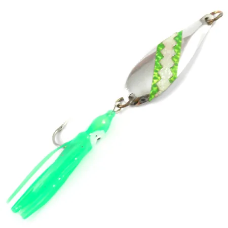 Tämä aidolla hopeoinnilla viimeistelty vetolusikka erottuu korkealaatuisella viimeistelyllään ja amerikkalaisilla valmistusjuurillaan. Tamiron Sporting Goods, joka perustettiin alun perin Kanadassa mutta toimii nykyään Yhdysvalloissa, painottaa paikallista käsityötä Honeybees 1 Glow -sarjassaan. Rungossa on selkeä siksak-kuvioinen teippaus – jossa vuorottelevat kirkkaanvihreä ja valkoinen pimeässä hohtava pinta – joka on kiinnitetty heijastavan hopeoidun pohjan päälle. Kooltaan 5,5 cm (2 1/4") ja painoltaan 3,5 g (1/8 oz) oleva yksilö on suunniteltu erityisesti uisteluun. UV-valossa teipin fluoresoivat ominaisuudet tulevat erittäin näkyviksi, ja kokonaisuuden täydentää peräkoukkuun asennettu pehmeä vihreä kalmarihuppu. Metallin kääntöpuolelle on stanssattu valmistajan merkki takuuna aitoudesta. Tuotekoodilla 3283 varustettu viehe on 5/5-kunnossa, pinta on puhdas ja koukut terävät. Tässä mallissa yhdistyvät perinteinen hopean välke ja moderni hohtotekniikka näkyvyyden parantamiseksi syvemmissä vesissä.