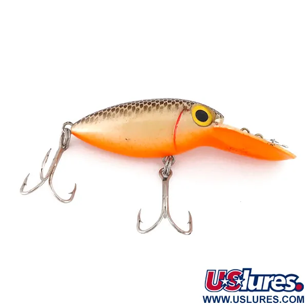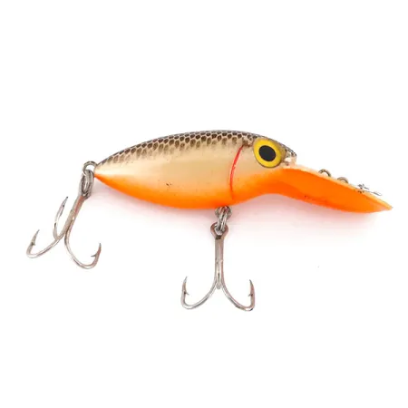 Oranssi hallitsee tämän yksilön alaosaa, sulautuen kauniisti toteutettuun hopeiseen ja kultaiseen suomukuvioon kaarevalla selkäpuolella. Tämä The Producersin USA:ssa valmistama Willy’s Worm kantaa tuotekoodia 9588 ja on 5/5-kunnossa. Vaappu on 2" (5 cm) pitkä ja painaa 1/4 oz (8 g). Siinä on erottuva, ylikokoinen uintilevy syvän veden esityksiä varten. Suuret keltaiset silmät näkyvillä mustilla pupilleilla ovat tämän mallin tunnusmerkki, luoden rohkean kiintopisteen teksturoitua suomupintaa vasten. Alkuperäiseen varustukseen kuuluu kaksi hopeoitua kolmihaarakoukkua, joista toinen on vatsassa ja toinen pyrstössä. Leveään, pyöristettyyn levyyn esikiinnitetty viehelukko varmistaa, että se on säilynyt juuri sellaisena kuin se lähti tehtaalta. Siirtymä kirkkaasta oranssista vatsasta tummempaan, metalliseen selkään heijastaa aikakauden korkeaa valmistuslaatua.