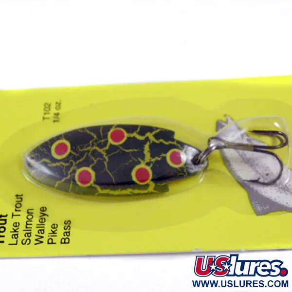 Tämä Yhdysvalloissa valmistettu 7 g (1/4 oz) painoinen Thomas Buoyant -lusikkauistin on klassikko taimenen ja muiden petokalojen kalastukseen. 4,5 cm (1 3/4") pitkä runko on varustettu "Frog"-kuviolla, jossa on tumma pohja, kirkkaankeltaisia särökuvioita ja kirkkaanpunaisia yksityiskohtia. Viehe on käyttämätön ja pakattu alkuperäiseen keltaiseen pahvipakkaukseensa, jossa mainitaan sen teho järvitaimenesta ja lohesta aina haukeen ja ahveneen. Tuotekoodilla 0740 merkitty malli on varustettu tehdasasenteisella kolmihaarakoukulla ja vankalla uistinrenkaalla. Pakkauksen kulmaan painettu "MADE IN U.S.A." vahvistaa alkuperän ja kertoo Thomas Spinning Lures -yhtiön pitkästä historiasta. Väriyhdistelmä T102 on suunniteltu näkymään erinomaisesti heitto- ja uistelukalastuksessa.